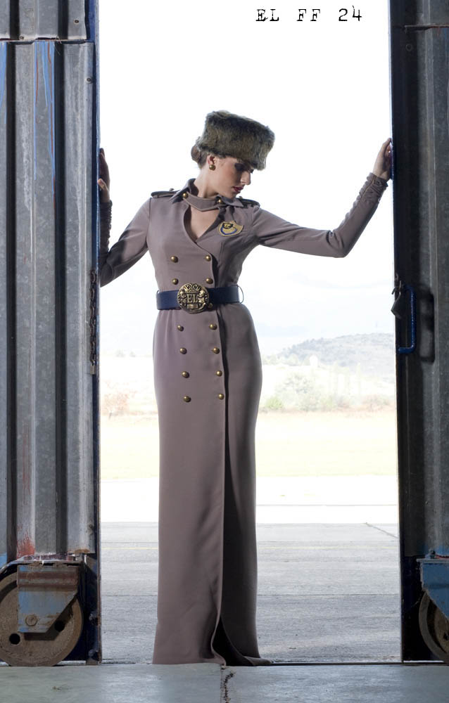 Elena showed massive collection of 80 models that focus on the references taken from the 40s, post-war fashion and militaristic style. Most models resembled the military suit with exaggerated epaulettes, gold buttons and emblems, even the evening toilets have ''war influence''.